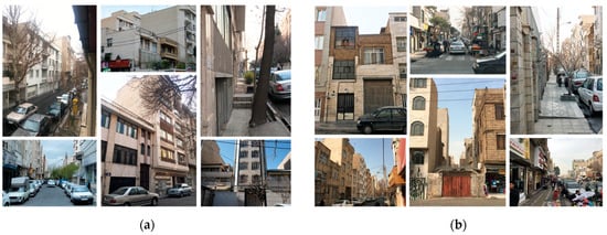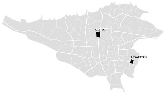 At the second stage, four selection criteria were applied to the identified neighbourhoods as urban layout, land-use, housing\building type, and population density. These criteria are derived from the urban form model proposed by Dempsey et al. [88]. The aim of this step was to select neighbourhoods with similar urban layout, land-use pattern and housing type, and different population density levels. The fixed preferences for the three urban form elements were gridiron pattern for the layout, residential use for the land-use and row-apartment for the housing typology. Adhering to these criteria ensured that the selected neighbourhoods represent the physical features of the particular typology that is the main setting of urban densification process in Tehran. Among the ten identified neighbourhoods, four areas represented gridiron urban layout, residential use and row apartment typology. Lastly, a formal population density classification [89] was used which categorise Tehran’s neighbourhoods into five classifications, from very low to very high gross population density: very low (1–70 pph); low (70–130 pph); medium (130–200 pph); high (200–300 pph); and very high (300–400 pph). All the four neighbourhoods fell into the ‘high’ and ‘very high’ categories. Among those, Gisha (high population density) and Afsariyeh (very high population density) were selected because of their different geographic location in the centre and periphery of Tehran (see Figure 1, Figure 2 and Figure 3).
