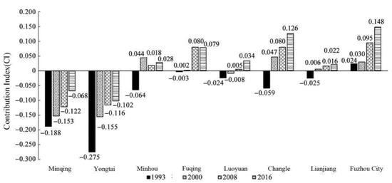 - Based on the urban areas and LULC types of Fuzhou, the CI was calculated. The results showed that the urban areas of Fuzhou made a positive contribution to the rise of LST, while Minqing and Yongtai was a negative contributor from 1993 to 2016. Overall, the temporal and spatial distribution of LST contributions in Fuzhou counties and urban areas were found to be uneven. Forest or grass land, wetland, and water had cooling effects, while construction land had warming effects. Wetland’s contribution to the LST increase changed from negative to positive.