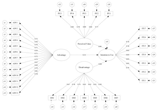 | Intention to Use | <--- | Disadvantage | −0.114 | −0.084 | 0.028 | −4.146 | 0.000 |