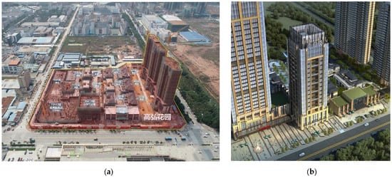 (a) Aerial photography of the construction site and (b) aerial render of the case study neighborhood “Gaohong Century Center”.