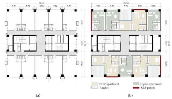 The entire high-rise building was redesigned using a mix of three different apartment sizes (50, 75, and 100 m2), with the addition of outdoor spaces, balconies, duplexes, and new services (Figure 9). Dynamic thermal and lighting simulations were performed on an as -built and post-renovation configuration on a typical floor plan consisting of seven apartments. In particular, the overall annual energy needs for heating and cooling decreased for the considered floor by about 66%, with the major energy savings being observed during the summer period. As regards to the lighting simulations, it was shown that despite the insertion of the panels, good levels of natural lighting were maintained, while in certain cases, the insertion of the loggias allowed natural light to reach the inner areas of the floor. As briefly shown, several tests were performed previously to fully understand the change in response of one-story one-bay RC frame subjected to in-plan loads due to the insertion of a CLT panel. Lastly, analyses were conducted on two 2D frames coupled with half of the concrete core, and the CLT infill allowed the structure to achieve a lower interstory drift and a higher peak load.