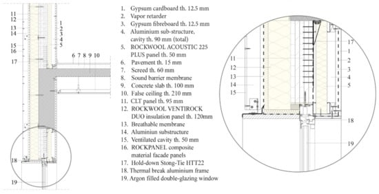 The internal walls, which separate the apartments from unheated zones, are composed of two leaves of hollow clay bricks (20 cm thick in total) with an intermediate air cavity. In the analyzed post-renovation configuration, about one-third of the glazed surface was replaced with the addition of CLT panels. These pre-assembled structural panels (U-value = 0.1496 [W/m2K], Ms = 115.1170 [kg m−2]) comprise 95 mm CLT panels, which are coated both on the internal and external side by a layer of thermal insulation (rock wool) 50 mm and 120 mm, respectively (Figure 4).