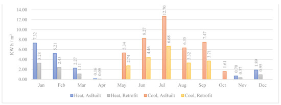 Figure 5 shows the results of the dynamic energy simulations in terms of heating, cooling, needs per unit net useful surface (kWh/m2) for pre- and post-renovation state. As insufficient information was available to model the thermal bridges, their contribution to the energy needs were considered by adding 10% and 5% to the results of the total heating and cooling needs, respectively. The percentage of addition to the thermal needs is consistent with the value suggested by UNI 11300 Standard for an existing non-insulated RC-framed buildings [43,44]. This percentage was applied to both pre- and post-intervention needs, although a correct design of the new façade could have eliminated or considerably reduced thermal bridges. The obtained results (Figure 5) show that, due to the interventions, the energy requirement for heating fell by 57.8% while the need for cooling, which has the major impact on global consumption, fell by 55.2%. Overall, the application of the proposed panels allowed for a reduction in global energy demand of 56%.
