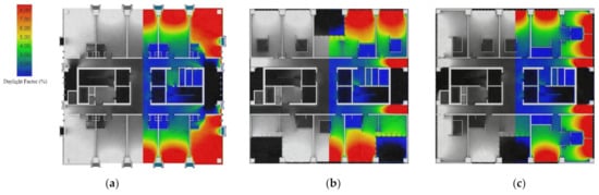 (a) Daylight factor detected in September (12:00 a.m.) with partially overcast sky for as-built configuration; (b) (c) two post-renovation model floorplans.