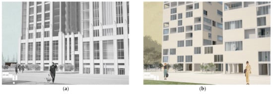 (a) Render images of as-built east elevation of the case study; (b) post renovation east elevation of the case study.