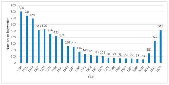 There were 804 breweries in the Czech Republic in 1900. During the first World War, the brewing industry was impacted very negatively. Breweries had a set ration of barley, which covered approximately one-quarter of what was needed. In 1916, processing barley and malt was completely banned. Brewery equipment from copper, brass and bronze was disassembled for war purposes. Production declined to a mere 14% of the pre-war level during the war. During this time, 122 breweries closed. This trend continued, and in 1918 there were 526 active breweries in Czechoslovakia. After 1918 there were no new breweries because of the difficulties in Czechoslovakia caused by the war, such as low standard of living, shortage of goods and loss of foreign markets and destruction of machinery [24]. The crisis in the brewing industry was also caused by the changes in beer production and increased beer prices. Production was concentrated in bigger production units since 1923, so this caused another decline in the number of active breweries—there were 456 in that year [24]. This trend further continued with the beginning and course of the second World War when there were 374 breweries in Czechoslovakia. In 1946, the Economic Group of Brewing and Malting Industry was created and later a National Company of Czechoslovakian Breweries was created, and breweries with a production volume of over 150,000 hectoliters were nationalized. The change of the ownership structure was the beginning of an orientation towards a planned economy with the consequence of (1948) the establishment of 22 national businesses, which associated 194 active breweries at that time. Central planners decided on the number of breweries and their production, as well as the amount of beer to import and export. During this time, there was almost no beer imported to Czechoslovakia. As for the type of beer, the only produced and consumed beer during this time was lager. Lagers produced during this period were, however, more differentiated by taste and quality than they are today [24].