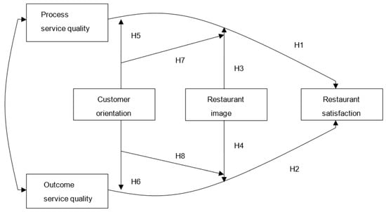 Customer orientation should also relate indirectly to the effects of process service quality. The coping framework that addresses the connection between cognition and arousal [59] supports our argument. Hence, the direct impact of customer orientation positively enhances H3. This logic also applies to H4, which addresses the moderating effect of restaurant image between outcome service quality and customer satisfaction. Therefore, our final two hypotheses are as follows: