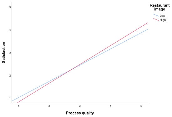 Regarding the H3 results, the effect of the outcome service quality–customer satisfaction linkage depended on the impacts of the restaurant image. As shown in Figure 2, we found that the proposed relationship increases when restaurant image is highly positive. On the other hand, our analysis showed that the same relationship decreases when both satisfaction and process service quality are low. These moderating effects on restaurant image are consistent with previous studies even though the restaurants we analyzed were coping with the COVID-19 pandemic.