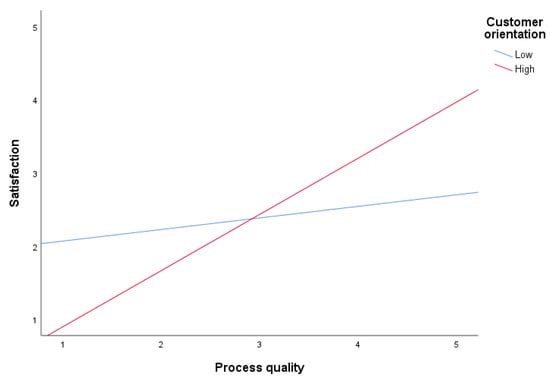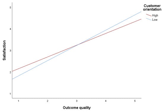 Both H5 and H6 proposed that customer orientation moderates the service quality–customer satisfaction linkage. Our analyses showed that both process (ß = 1.65, p < 0.05) and outcome service quality (ß = 1.04, p < 0.01) played important roles in moderating the proposed relationship, supporting H5 and H6. However, the moderating effects of customer orientation differed among service quality types. Specifically, for process service quality, we found that the proposed relationship increases when customer orientation is high (see Figure 3). On the other hand, our analyses showed that when outcome service quality and satisfaction are high, the proposed relationship appears somewhat stronger when customer orientation is low (see Figure 4). The latter is interesting in the context of the COVID-19 pandemic because the interaction is possible when outcome service quality and satisfaction are extremely high. Despite this unexpected finding, when outcome service quality and satisfaction are relatively low, the proposed relationship appears stronger when customer orientation is high.