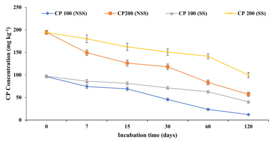 An incubation trial was performed in the growth room at the Institute of Soil and Environmental Sciences, University of Agriculture Faisalabad, Pakistan, to test the degradation behavior of CP in unamended (sterilized and non-sterilized) and amended (sterilized and non-sterilized) soils with biochar and compost. The soil (sandy clay loam) was collected from the upper (0–30 cm) farm area of Village No.132/GB in Faisalabad, Pakistan. The soil was air dried in the shade for one week, and thereafter sieved using a 2 mm sieve and mixed thoroughly. Biochar was produced at a pyrolysis temperature of 500 °C using wheat straw as a feedstock under limited oxygen conditions in a laboratory muffle furnace as previously stated [31]. Compost was produced from agricultural waste material and plant leaves as described previously [32]. After homogenization and drying at room temperature for 7 days, both amendments were finely grounded and sieved <200 µm. The physicochemical characteristics of the biochar, compost and soil are given in Supplementary Data Table S1. The two amendments (biochar and compost) were thoroughly mixed with the soil by hand to achieve loading 0.50% (w/w) for biochar and compost, respectively. Soil was taken in glass jars (200 g each). Before the experiment, the soil in the jars was pre-incubated for a week at 25 °C at 40% of water holding capacity (WHC). The soil was spiked with a CP solution (prepared in acetone) to give two spiked concentrations of 100 and 200 mg CP kg−1 soil. The full treatments descriptions and their abbreviations are elaborated in Supplementary Data Table S2. The capped jars were shaken on a rotary shaker for 24 h in order to facilitate complete mixing of soil and pesticide solution and were subsequently placed unsealed in fume hood for two days to allow for the evaporation of acetone. Another set of jars were prepared identically in three replicates with the same treatment combinations as above, except sterilized soils were used in each treatment. Soil was sterilized twice (prior to spiking with CP solution) in an autoclave at 120 °C for 30 min under 300 kPa pressure chamber [33]. The jars were incubated in the dark at 20 ± 5 °C for four months, where soil moisture was maintained (at 40% WHC) by adding distilled water. The sterile distilled water was used for sterile soil treatments. In order to avoid disturbance and to ensure accuracy, separate set of jars were prepared for each sampling date. Soil samples (20 g) were periodically taken from each jar at 0, 7, 15, 30, 60 and 120 days. The collected soil samples were divided into two subsamples for pesticide and enzymatic analysis. The samples for pesticide residual concentration were stored at −20 °C so that the pesticide recovery may not be affected while. For the soil enzymatic analysis, the samples were kept at 4 °C, and enzymatic analyses were completed within 48 h of sample collection for each respective interval.