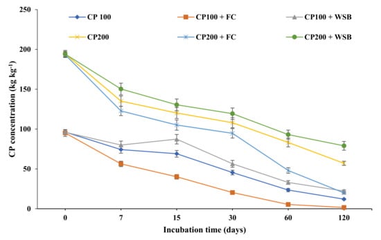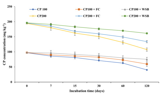 CP degradation was more inhibited (lower degradation rate; longer half-lives) for CP200 compared to CP100 throughout the incubation in both amended and unamended soils. A reduced degradation efficiency with increasing CP concentration was previously reported by [55,56] in an organic mixture and by [57] in a soil. At higher CP concentrations, one of CP’s main metabolites, 3,5,6-trichloro-2-pyridinol (TCP), starts to increase in concentration and could be a cause of CP-reduced degradation [58,59].
