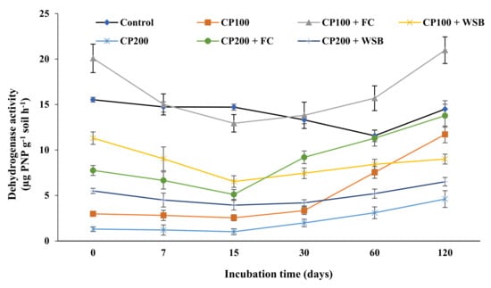 Soil enzyme activity is a key biochemical factor assessing soil quality due to its sensitivity to toxicity and disturbances [60]. In agreement with previous findings [47,61,62,63], the results of this study indicated that CP inhibited soil dehydrogenase, urease and phosphatase activities. In the CP-contaminated soil, the maximum reduction in dehydrogenase, urease and phosphatase activities was observed at day 15 of the incubation, which was in agreement with a previous study [47]. The decrease in soil enzyme activities in CP spiked soils could be attributed to the increased microbial toxicity of byproducts formed during degradation [28]. The recoveries of enzyme activities in the later stages of incubation may be due to significant pesticide loss via degradation, thus reducing pesticide toxicity [47,53] and recovery of microbial growth as manifested by the alleviated soil enzymes activities in our results.