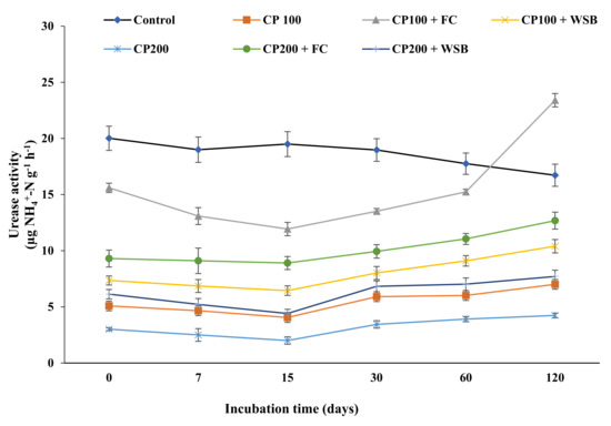 The effect of CP on soil urease activity in the unamended and amended soils over an incubation period of 120 days is shown in Figure 5. CP negatively affected soil urease activity at both initial CP concentrations (CP100 and CP200) throughout the incubation period. The decrease in urease activity was maximum at day 15 with reductions of 79 and 90% for CP100 and CP200, respectively, relative to the control (CP0B0C0). After day 15 urease activity gradually increased across the incubation period. At both initial CP concentrations of 100 and 200 mg kg−1, the compost and biochar significantly (ANOVA: p = 0.000) reduced the negative effects of CP on soil urease activity, where the effect was more evident for the treatment CP100 + FC. However, in all treatments, urease activities remained lower than the activity observed in the control (CP0B0C0) soil (over the whole incubation period), except for CP100 + FC at the last stage of incubation, at which time urease activity was 28 and 70% higher than in the control and unamended contaminated treatments (CP100), respectively. Amongst the amended contaminated treatments, maximum urease activities (15.6 and 23.4 µg NH4+-N g−1 h−1) were observed for CP100 + FC at day 0 and 120, respectively, and minimum urease activities (6.14 and 7.72 µg NH4+-N g−1 h−1) were recorded with CP200 + WSB at day 0 and 120, respectively.