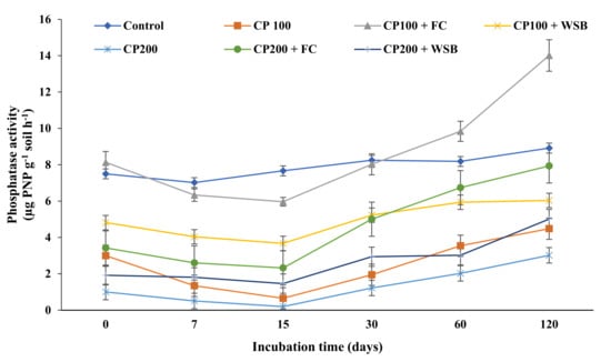 The effect of CP on soil phosphatase activity in unamended and amended soils during the incubation period of 120 days is shown in Figure 6. In the unamended contaminated soil, the phosphatase activity was significantly (ANOVA: p = 0.000) reduced by CP at the start of incubation period, with 60 and 87% less phosphatase activity (3 and 1 µg TPF g−1 soil 12 h−1) for CP100 and CP200, respectively, compared to CP0B0C0 (7.5 µg PNP g−1 soil h−1). At both dose levels, 100 and 200 mg kg−1, significantly (ANOVA: p = 0.000) higher phosphatase activities were observed with the application of compost and biochar amendments. However, with compost (CP100 + FC), these activities were even higher (ANOVA: p = 0.000) than the uncontaminated control soil (CP0B0C0) at the last two stages of incubation. In all amended and unamended contaminated treatments, the phosphatase activity initially decreased to day 15, and thereafter, it stabilized and slowly increased until the end of incubation. Amongst all treatments the maximum phosphatase activities (8.13µg PNPg−1 soil h−1) and (14.01 µg PNP g−1 soil h−1) were observed with CP100 + FC at day 0 and 120, respectively, and the minimum phosphatase activities (1 µg PNP g−1 soil h−1) and (3.02 µg PNP g−1 soil h−1) were observed with CP200 at day 0 and 120, respectively.