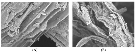 SEM images of the pretreated sugarcane straw with magnification of 1000×: (A) HNO3 pretreated sugarcane straw; (B) NaOH pretreated sugarcane straw following acid pretreatment.