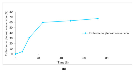 As can be found from Figure 2B, the conversion percentage of cellulose to glucose for enzymatic hydrolysis at 6, 12, 24, 48, and 72 h was 4.63, 30.87, 59.98, 63.05, and 67.15%, respectively, indicating an increasing trend in the conversion of cellulose to glucose with period of hydrolysis. It is noteworthy that a high yield of glucose conversion was obtained in the first 24 h enzymatic hydrolysis. This result showed that glucose conversion reached about 70% in 72 h of hydrolysis, but about 60% of conversion yield was achieved in the first 24 h.