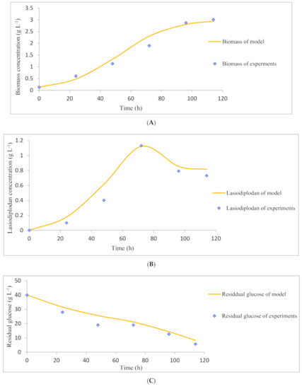 The Leudeking–Piret kinetic [41] was utilized to describe lasiodiplodan production as shown in Equation (5):