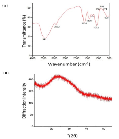 The FTIR spectra of the lasiodiplodan produced by L. theobromae CCT3966 have been illustrated in Figure 4A. The fingerprint areas between 774–938 cm−1 pointed out the presence of bands of glycosidic linkages with the β-type structure, which can be found in several microbial glucans. Peaks and bands between 1000 and 1200 cm−1 indicate axial deformations on C-C, C-H and R-C-O-C-R (ether) linkages. The absorption peak shown in the 1072 cm−1 could indicate the symmetrical stretching vibrations of C = O bonds showing the characteristic of the pyranose ring present in the monomers of glucans. The bands at 1255 cm−1 of FTIR spectra revealed the C-O-C asymmetric stretching vibrations. The band observed in the region 1406 cm−1 could be attributed to the symmetric deformation of CH2 and COH groups. In this regard, the absorption peak at 1633 cm−1 shows the C=O bond, which represents the presence of the glucose ring. The absorption peak detected at the 2932 cm−1 is related to the C-H stretching of the CH2 group. The peak shown in 3411 cm−1 indicates the hydroxyl group (OH) stretching.