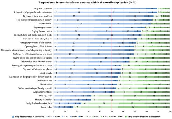 Prior to the start of the primary research, a brainstorming method was used to generate a larger number of ideas on the basis of which the questionnaire was developed. Ten people participated in the brainstorming, two participants from each age category (up to 15; 15–30; 31–45; 46–60; over 60 years). The first brainstorming question was: “Which aspect in the city needs to be streamlined or improve?” and most of the ideas concerned streamlining the communication between city management and citizens. The second question was: “How could this communication be made more efficient?”, where the most common answer was through a mobile application. The question was: “In which areas in the city is it possible to streamline this communication?”, where many ideas were offered, which were concretized by the following question. The last question was: “What services and features should the application include?” All answers were included in the questionnaire. The questionnaire examined the respondents’ interest in individual services. The questions were designed in such a way that all services were listed, and the respondents decided whether they would be interested in them or not. The research also included identification questions, based on which respondents were, for example, categorised according to age or the extent of their digital skills.
