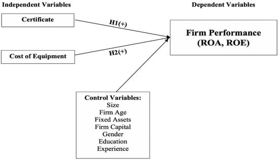 In Vietnam, for example, the policy for addressing environmental degradation by the manufacturing sector has been applied since 1999, indicated as Environmental Certificates or ISO 14001 by Vietnam’s National Strategy for Environmental Protection in the period of 2010–2020 []. Applying environmental or ISO regulations offers benefits to SMEs, such as reducing waste management costs and decreasing the energy consumption or materials used. Also, following the studies of Casio [], Marcus and Willig [], Woodside [], Cheremisinoff and Bendavid-Val [], Morris [], and Sheldon [], certificated firms also surpassed others by the performance of firms since they had made more remarkable progress in enhancing firm-image, saving costs for regulation infringement, and improving stakeholder relationships []. We will propose the first hypothesis to examine how environmental certificates affect Vietnam’s SMEs performance from the discussion above.