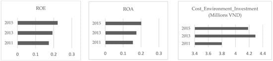 Cost of equipment is the total expenses the firm spends to buy equipment for treating environment-related problems from 2011 to 2015 (Figure 2). In terms of the cost of equipment, Oxborrow [] has proved a positive and significant effect of green technology on competitiveness, facilitating firm performance. In addition, the cost of equipment is considered a key to boosting the firm’s profit [].
