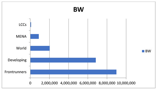 Cater [125] argued that the least developed nations face enormous obstacles in reaching even the low development levels of other poor nations; our study’s findings show that the same is true 33 years later. As discussed, the international Internet bandwidth per capita remains particularly low in the LDCs, suggesting that the lack of international connectivity remains a major bottleneck in the Internet infrastructure of these countries. The findings show that the share of bandwidth for these countries is less than 1%. In addition, there is a sharp digital divide with the rest of the world and the most developed ICT nations. Figure 2 compares the international internet bandwidth of LDCs with four other categories namely Middle East and North African (MENA), ICT developed nations, ICT frontrunners (ICT frontrunners are economies with very high performance in ICT access, ICT network, and innovation. These countries in alphabetic order include Australia, Canada, Finland, France, Germany, Hong Kong (China), Korea Rep., Japan, Netherlands, Norway, Singapore, Sweden, Switzerland, UK, and the USA) and the rest of the world.