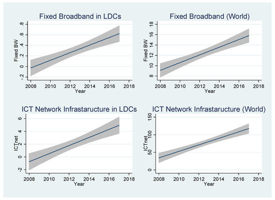 Figure 3 shows the existence of a digital divide in LDCs and the rest of the world from the perspective of fixed broadband networks, and the combined fixed broadband and international Internet bandwidth (ictnet). While the world average of fixed broadband network was around 12.45 Mbit/s per capita, the share of this network for LDCs was around 0.30, compared the frontrunners’ share of 33.80. This is important, because broadband networks are not only the backbone of today’s IoT, but also the infrastructure for innovation, and the knowledge economy in general. According to OECD and WTO [126], high-speed affordable broadband access is essential for social and economic development. Technological advances in areas such as IoT and artificial intelligence, combined with hyper-connectivity, are leading to an increasing variety of services and applications that can serve economic, social, and entertainment needs [126].
