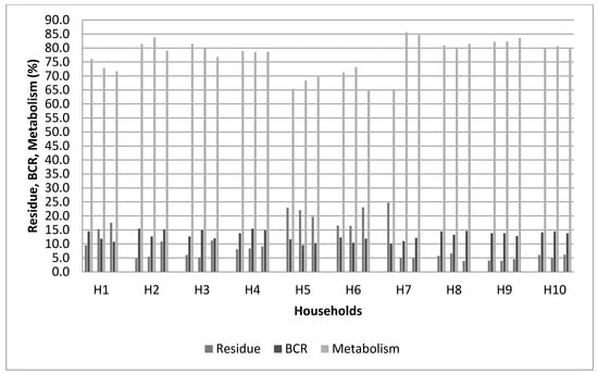 Relative proportion of biowaste converted to residue R (%), larval biomass (%) (BCR), and metabolized waste (M%) on feeding household kitchen waste to BSFL. Each house (H1, H2,⋯H10) represents 3 BSFL bins placed for 15 days one after the other.