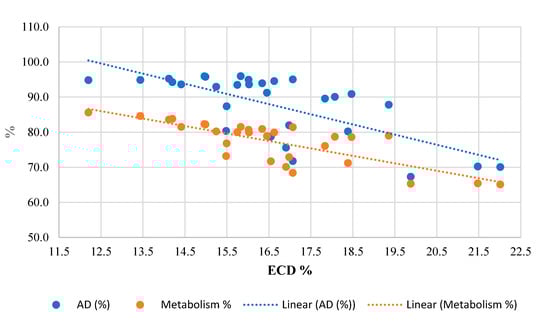 Results of the study showed that metabolism of BSFL significantly affected ECD values (ANOVA, p < 0.05), whereas the effects of AD were not statistically significant (ANOVA, p > 0.05; Figure 3). ECD may vary within same species of insects due to several factors. Higher metabolism rate of the insect to utilize food for energy may lower its ECD values [36]. This trend can clearly be observed in Figure 4. Therefore, the factors influencing metabolism of BSFL may affect its ECD value. In this study, the highest ECD (22.0%) was achieved in BSFL bin KW26 with the lowest metabolism (65.1%) and the lowest ECD (12.2%) was recorded for bin KW17, showing the highest metabolism (85.6%; Figure 4). It is also possible that due to higher metabolic activity, BSFL increased their actual digestibility, which may result in reduced ECD [36]. This trend can be observed in Figure 4 and also in a past study [37]. Figure 4 shows that both AD and metabolism are inversely proportional to ECD. However, all points are not linear to the straight line as this variation is not always due to the maintenance of homeostatic balance within an insect’s body [36]. It might be due to other factors, which include availability of essential nutrients (especially protein) in sufficient concentrations considered critical for larval growth [36,38,44]. ECD does not directly depend on digestibility. A higher ECD value is an indication of better larval efficiency to convert actually digested waste into its body mass [6]. In practice, it is difficult to identify cause–effect relationship for conversion efficiencies. It is possible that an insect consumes more because of low digestibility, or digestibility could be low because of a high food consumption rate [36].