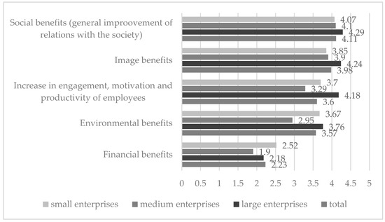 The above results allow to maintain the hypothesis that for large enterprises that implement CSR postulates, image benefits are very important, while financial benefits may be distant in time. It should be added, however, that also other benefits (social, environmental, organisational) are more important than the financial benefits expected as remote in time. It is also worth pointing out that this regularity concerns not only large enterprises, but also medium and small ones.