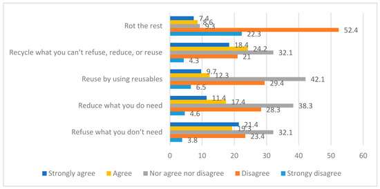 The respondents were also asked to express their views on how they and the people around them should live if they followed the principles of zero waste. The respondents were asked to evaluate five key principles of zero waste, where 5 means strongly agree and 1 means strongly disagree. Results are plotted in Figure 1.