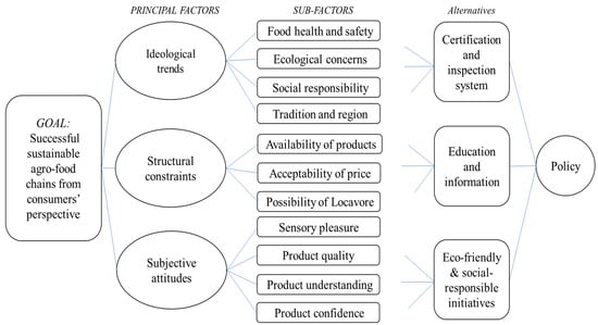 The Analytical hierarchy process (AHP) structure for sustainable agro-food consumption.
