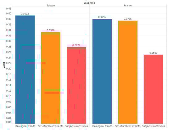 The pairwise comparisons also show the priority between three principle factors as well as their corresponding ranks. It tells us the relative importance of three groups from respondents. The results of the importance for the principal factors can be shown in Figure 2. In both Taiwan and France, the principal factor of ideological trends is the most important factor, followed by structural constraints. However, the importance of the two principal factors in Taiwan is quite different, while that in France is not. In addition, the principal factor of subjective attitudes is the lowest in the two case areas. It can be seen that under the ideological trends/social norms, health, ecology, social responsibility, and local traditional characteristics are still the main central thinking in sustainable consumption. On the other hand, it can be seen that the subjective attitudes of product sensory, quality, understanding, and trust are less valued by consumers in sustainable food consumption. In other words, sustainable food consumption patterns often care less about the quality and understanding of, and confidence regarding food, and more on the impact of the food regarding the environment, society, and regional development.