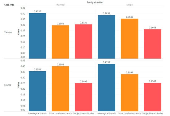 If we consider the difference in marital status, the result is shown in Figure 4. There is no obvious difference in marital status in the principal factor. In Taiwan, regardless of the marital status, the ideological trends are the main factors of sustainable food consumption. In addition, married people in Taiwan have significantly increased the importance of subjective attitudes related to quality and senses. In France, married people pay more attention to structural constraints, but it is not obvious.