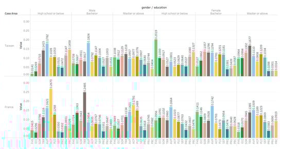 The analysis of cognitive differences that consider the education level is shown in Figure 5. In Taiwan, there is an interesting gender difference regarding education level below high school; that is, women pay special attention to health, but men do not. In this survey, people with education levels below high school in Taiwan are also older. This apparent difference in the importance of health may also be related to the factor that the women in Taiwan usually play an important role in family care. The men in Taiwan whose education level is below a bachelor’s degree are particularly concerned about the availability of products. With the improvement of education level, the difference in the importance of the various factors of sustainable food consumption by the people in Taiwan has decreased, but it can be seen that the tradition and region (TRR) is slightly emphasized. In France, males below the high school education level pay special attention to the price factor, the bachelor education level pays more attention to the TRR, and the difference between the master education level and above is narrowed but slightly emphasizes the price. On the other hand, women in France, regardless of their education level, pay more attention to AVP. From the analysis and observation of the educational level part, it is difficult to see consistent results. Although it can be used as a reference, it may also reflect that the level of education may have less impact than other demographic factors.