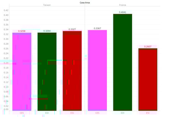 To understand what consumers seek for change will be more meaningful because they are the ultimate target of the policy and it also provokes the possibility of transition. In this section, we will explore three possible potential policy opportunities: (1) reinforcement of certification and inspection systems (CES): rebuilding consumers’ confidence on eco-labelled agro-products; (2) promotion of education and information (EDI): creating consumers’ basic awareness and understanding, and eliminating potential asymmetric information and ambiguity; and (3) incentive of eco-friendly and social-responsible initiatives (ESI): reinforcing the ecological components, social welfare, and equality for future development and technology of agricultural and food processed sectors. The results of the overall analysis of the policy alternatives of the two case areas can be referred to as shown in Figure 6. The AHP analysis is based on the 11 important sub-factors of sustainable food consumption and is the result of a pairwise comparative analysis of the three policy alternatives. In Taiwan, the three policy alternatives received similar grades. In France, education and information is the highest, followed by certification and inspection systems. In addition, without using the AHP method, this survey also directly asked consumers what the most important policy direction is. Without AHP, the “education and information” was ranked as the first important alternative in both Taiwan and France. This direct ranking is consistent with AHP results in the French case. However, in the case of Taiwan, the “education and information” was the last one in the AHP result but the first one in direct ranking. It responds to the slight difference between the three policy alternatives of the AHP result, but the three alternatives can be considered as equally important in the case of Taiwan. At the same time, the AHP analysis method should be regarded as a more systematic objective analysis result that excludes subjective factors.