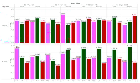 In summary, although Taiwan’s ESI measure ranks first, there is no significant difference in overall weight compared with other measures. Through the cross-analysis of age and gender, we can also find that CES and EDI-related measures are still the most effective strategy to promote sustainable food consumption, regardless of whether in Taiwan or France. On the whole, people believe in certification-related mechanisms more when younger and need more understanding of products when older.