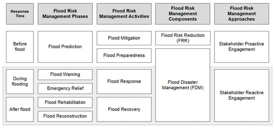 Freeman [9] introduced stakeholder theory with three key attributes for each stakeholder: power, legitimacy, and urgency. The power of a stakeholder enables them to make decisions and allocate resources in any event, particularly in crisis situations [27,28]. Legitimacy allows a stakeholder to withstand any risks, including opportunities and threats associated with the organization with logic and justification [12]. Urgency is the degree to which a stakeholder coordinates immediate actions and responds to risk at short notice [11,27]. The attributes of power, legitimacy, and urgency assist stakeholders in making a decision either proactively or reactively in disaster risk management. Figure 1 shows stakeholder proactive and reactive engagement in different flood risk management phases. A proactive approach includes tasks that are planned in the mitigation phase, and activities that are conducted in the preparedness phase by stakeholders before a natural hazard. A reactive approach includes response and recovery tasks that are executed by stakeholders during, and after a natural hazard [2,15,29].