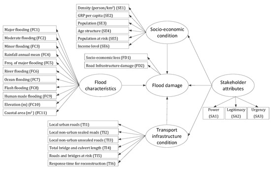 Based on a review of literature, Figure 2 shows the conceptual framework for investigating the role of stakeholders in managing flood damage in transport infrastructure and the inter-relationships between various variables. It includes five constructs: (1) flood characteristics (FC); (2) flood damage (FD); (3) socio-economic condition (SE); (4) transport infrastructure condition (TI); and (5) stakeholder attributes (SE). There are 28 measurement indicators for these five constructs that are extracted from the literature review. Flood characteristics are essential factors that have been used to define the damage caused by flood disasters. Frequency, location, and socio-economic characteristics tend to exacerbate the impacts of disasters on both communities and the built environment [31], and the type of disaster is a reliable predictor of specific disaster damage [32]. Merz et al. [33] proposed that flood type, the flood-generating process, hydrological response, location, density, and frequency are the most important characteristics of flood disasters. Finally, some studies have confirmed that flood type, severity, and frequency are the most important characteristics in predicting flood damage [2,34,35,36].