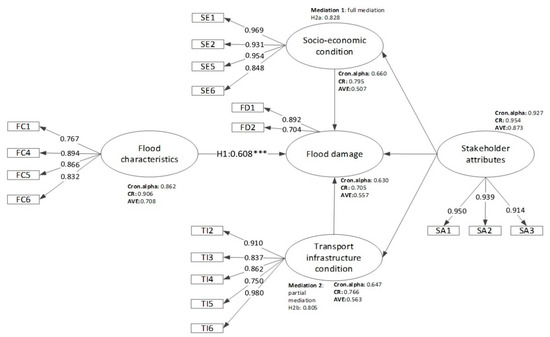 The indirect relationship explained the extent to which the variance of flood damage as a dependent variable was directly explained by stakeholder attributes as an independent variable. Table 6 shows that local councils’ stakeholder attributes had a meaningful impact on the socio-economic and transport infrastructure conditions, which, in turn, had a robust relationship with flood damage. The indirect effect of stakeholder attributes (path coefficient of 0.724, p < 0.01) via the mediator construct—socio-economic conditions—was significant, whereas the direct relationship between stakeholder attributes and flood damage remained significant (path coefficient of 0.104, p < 0.10). Thus, the socio-economic condition fully mediated the relationship between stakeholder attributes and flood damage, which provided empirical support for Hypothesis 2a.