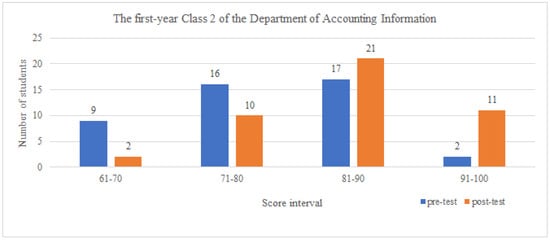 The results in Figure 2 show that 44 students participated in the pre-test in the first-year Class 2 of the Department of Accounting Information in the 2020 academic year, with nine students scoring less than 70, 16 students scoring less than 80, and 17 students scoring less than 90. Only two students achieved high scores in the range of 91–100. After the post-test results were observed, the number of students in the low-score range decreased to two; the number of students in the 81–90 score range increased to 21; and the number of students in the nearly perfect score range increased to 11. Overall, students’ reading ability can be judged to have improved significantly.