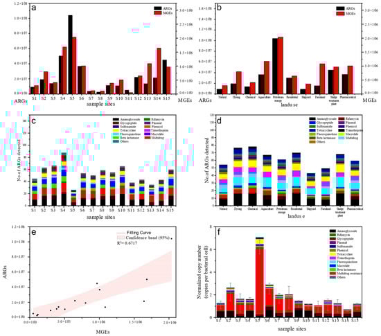 Soil ARG profiles along the Taipu River. ARGs and MGEs absolute abundance in (a) different sites, and (b) different land uses. The number of ARGs detected in (c) different sites, and (d) different land uses. (e) The correlation of total absolute abundance of ARGs and MGEs. (f) Relative abundance of ARGs per bacterial cell.
