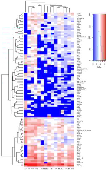A total of 100 high-abundance detected ARG subtypes and MGEs were profiled for further study (Figure 3). The sampling site was generally enriched with 32 ARG subtypes and MGEs, including 8 aminoglycoside ARGs, 7 multidrug ARGs, 4 macrolide ARGs, several other ARGs subtypes (tetracyclines, sulfonamides, beta-lactams, fluoroquinolone), and MGEs, of which aac-Via was the most abundant ARG subtype. Among the detected MGEs, IS1247, ISEcp1, intI 1, and trb-C were the most abundant. IS1247 was enriched in all of the samples, with the highest abundance in S4 and the lowest abundance in S8. The abundance of mef (B) and sulAfolP in the petroleum storage area (S5) was higher than that in other samples, but it was much lower for aadA7, aph6ic, spcN, aph4ib, tetG&F, QnrB4, and mdtg. The abundance of ISEcp1 and intI 1 in S5 was higher than other sites, but trb-C was the opposite.