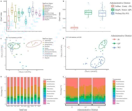 Microbial community differences in the soil of the Taipu River Basin. (a) Microbial alpha diversity of land uses and (b) regions. (c) Microbial beta diversity among land uses and (d) regions. (e) Microbial composition of land uses and (f) regions.