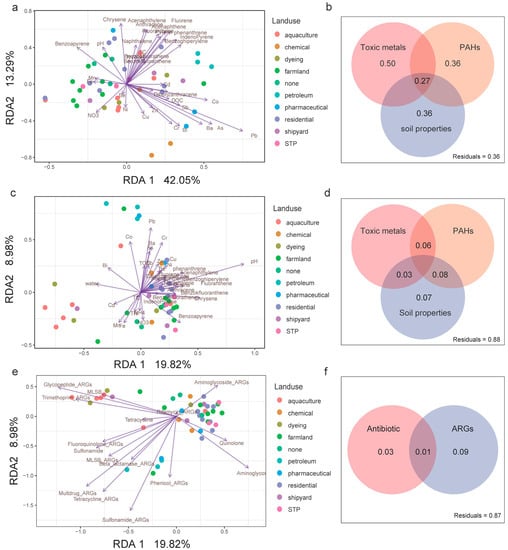 Redundancy analysis (RDA) and variance partitioning canonical correspondence analysis (VPA) was applied to show the contribution of soil chemical properties (pH, TC, TN, ammonia, nitrate), toxic metals (Be, Cr, Co, Ni, Cu, Zn, As, Pb, Cd, Sb, Ba, Bi), PAHs on ARGs, and bacterial community distribution with different land use (Figure 5). The vectors representing toxic metals and PAHs had similar directions with the first (interpretation: 42.05%) and second axes (interpretation: 13.29%), which affected the distribution of ARGs, respectively. Soil chemical properties, toxic metals, and PAHs accounted for 36%, 50%, and 36% of the total variance. The common interpretation of these factors was 27%.