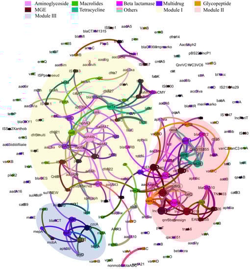 Network analysis was performed to analyze the relationships between MGEs and ARG subtypes (Figure 6), which included 6 soil microbial phyla, 100 high-abundance ARG subtypes, and 20 MGEs (Pearson’s r > 0.6, p < 0.01). Three modules were set up in the network. In module I, aminoglycoside ARG subtypes were the main part and MGEs were at the edge, while MGEs played a different role in Module II and III as hubs. Module II consisted of multiple ARGs, with ISEfm1, IS256, and IS26 closely linked to ARGs and other MGEs as hubs. The scale of Module III was small, but the contributing ARGs were widely distributed in the environment. Among them, intI 1 was significantly correlated with the higher abundance of ARG subtypes (qnrD, mepA, ttgA, and ttgB). Different from the coupling relationship between ARGs and MGEs, the main phyla of bacterial communities formed a relatively independent module in the co-occurrence network, and had no obvious association with ARGs and MGEs (Figure S1).