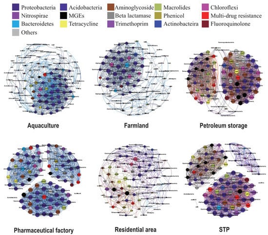 The results showed that ARGs and MGEs were widely enriched in aquafarms, pharmaceutical factories, and sewage treatment with a massive application of antibiotics [34,35,36]. In this study, the abundance of ARGs and MGEs within these land uses were higher than in other areas (except petroleum storage areas) (Figure 2). In addition, the distribution characteristics of ARGs in petroleum storage areas were extremely different from other sites, which further showed the important impact of land uses on ARG distribution.