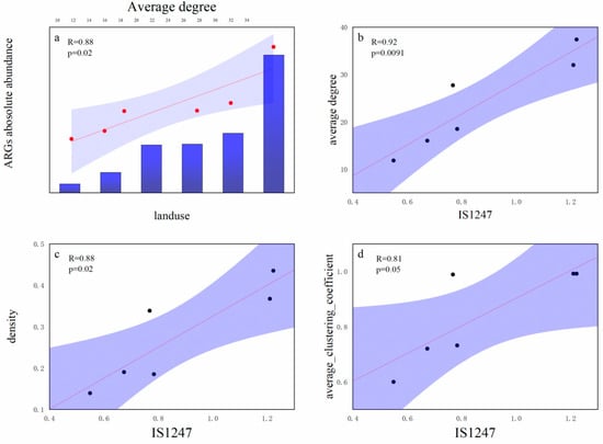 The Intl1 has been proven to be a common integron closely related to multidrug resistance [43,44,45,46]. The results and previous studies also showed that the intI 1 played a key role in the distribution of high-abundance ARGs and HRGs [47]. However, the ARGs that were significantly related to intI 1 revealed a non-significant impact on the ecological relationship of the soil bacterial community in the Taipu River Basin. Actually, the dominant MGE will be taken over as selective pressure changes or new genes enter the pool [48]. IS1247 was a common transposase in the co-occurrence network of ARGs and bacterial communities under different land uses, and can spread between different bacteria and pathogens [49,50]. It has been found to have a close correlation with ARG subtypes in water and the guts of insects, fish, and humans [51,52,53]. IS insertions can move regions adjacent to alter the ARG expression, enhance the niche adaptability of bacteria, and affect the structure of the bacterial communities [54,55,56]. Jose, etc., suggested that the co-occurrence network of integrons and microorganisms reflects the specific hosts of integrons, the dominant bacteria, and their relationship under resistance pressure [57]. This study showed that IS1247 was widespread in the Taipu River Basin, and was strongly related to the co-occurrence network properties (average degree, density, average clustering coefficient) of ARGs, MGEs, and the bacterial community (Figure 8), but not environmental factors, which indicated that IS1247 was a common and stable element that can be used to measure the impact of ARGs on the properties of bacterial co-occurrence networks. In other words, intI 1 can be regarded as an indicator of MGE-mediated ARG transmission under the influence of toxic metals, while IS1247 was more suitable as an indicator of the influence of ARGs on the bacterial community structure.