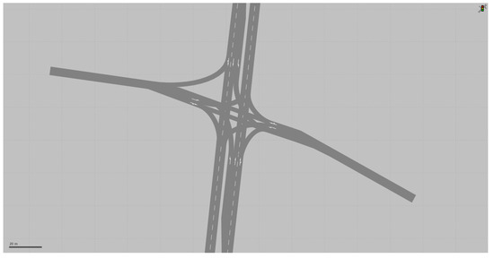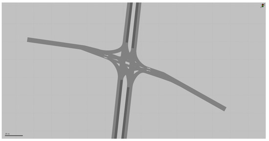 Traffic modeling and simulation can help us explore AVs’ implications on transport networks and transport infrastructure [22,23,24]. This study utilized the microscopic multi-modal traffic flow simulation software package PTV Vissim, developed by PTV AG to model complex road geometries [25]. In PTV Vissim, different sets of parameters define vehicles’ longitudinal and lateral behavior and their responses toward road infrastructure. A common signalized intersection was designed in PTV Vissim based on real-world cases in Belgium to examine the readiness of the current infrastructure. The study area is a cross at-grade intersection controlled by traffic lights where the speed limit is 50 km/h. The major branches each have two traffic lanes plus a dedicated left-turn lane, a channelized right-turn lane, and a median. The minor street has one traffic lane in each direction plus dedicated left-turn lanes. Lane width on the main street is 3.00 m (i.e., 9.84 feet), whereas, on the minor street, it is 2.50 m (i.e., 8.20 feet).