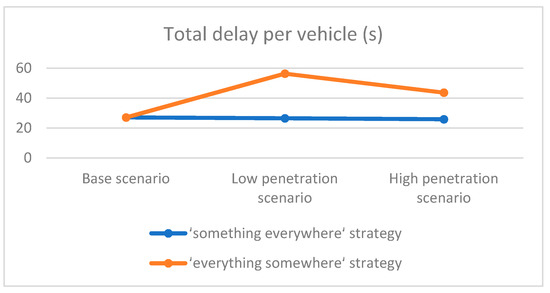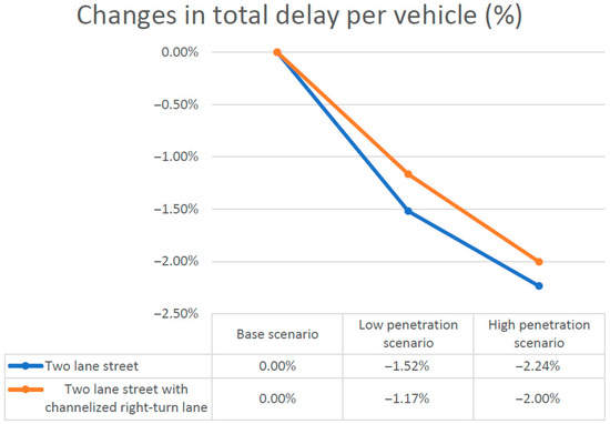 Changes in total delay per vehicle (%).
